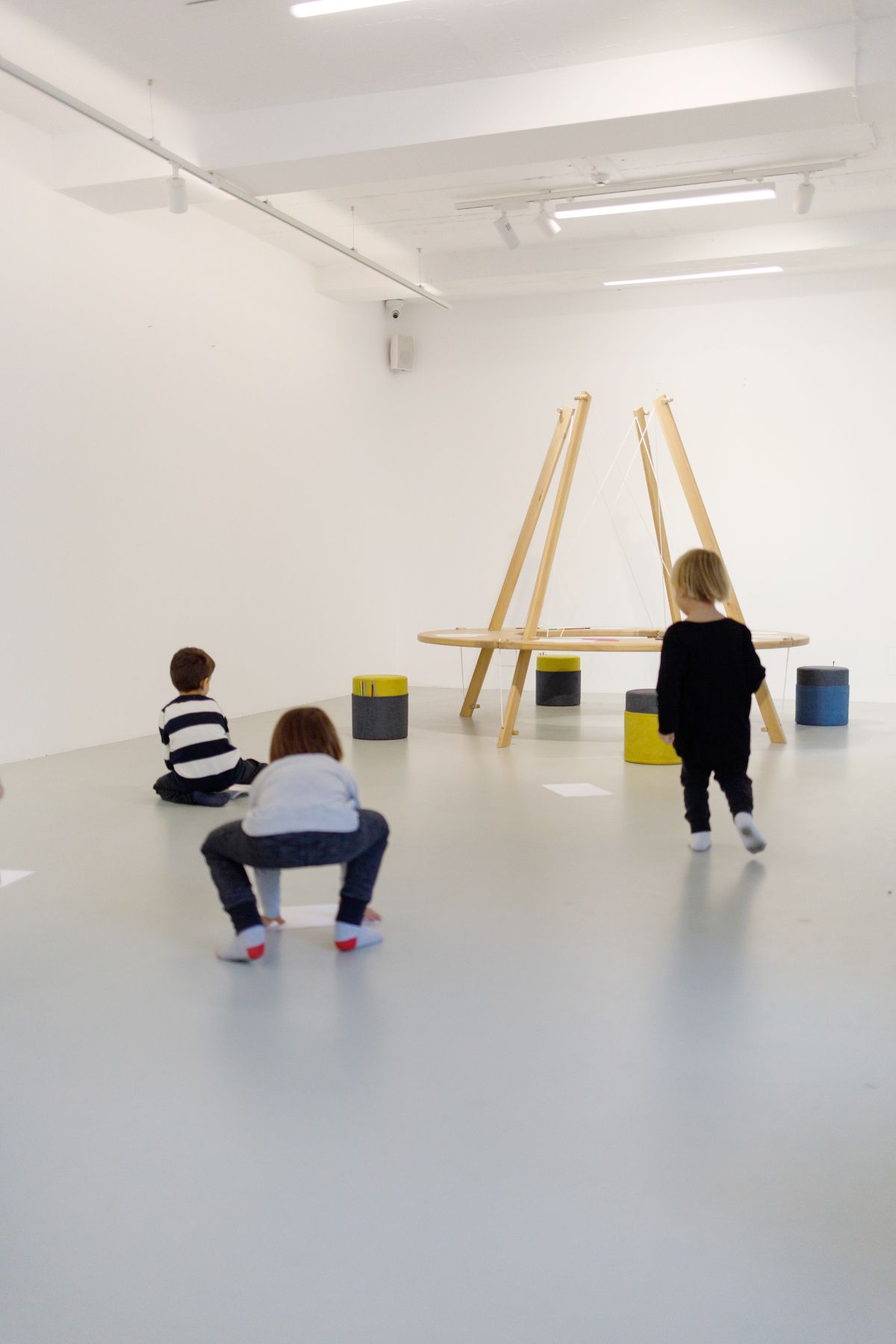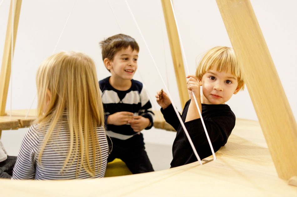 A spatial system aimed at preschool children. A circular wooden panel and four supports, joined together by ropes, make up the base of the spatial structure functioning as a workspace. Twelve children can play around the system, under it, or inside it.